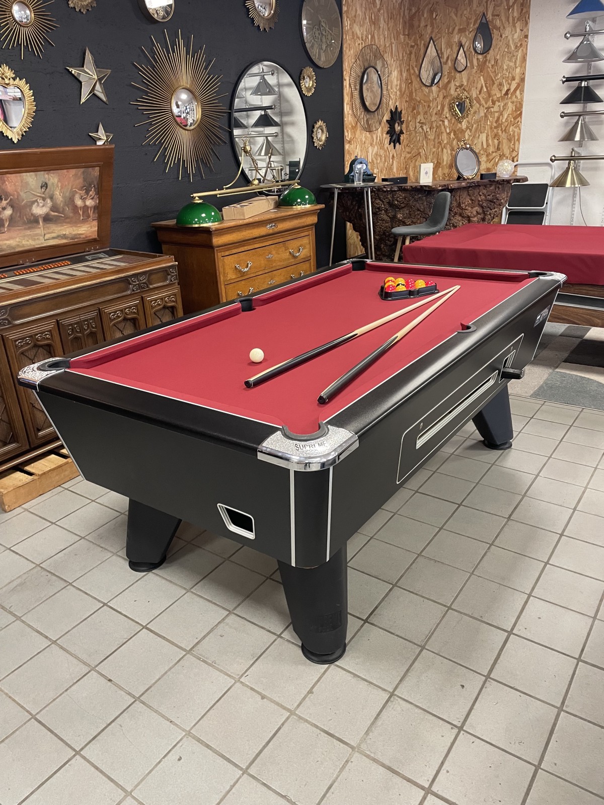 Voici un Billard Pool noir de type Bar avec tapis bordeaux, disponible à l’achat en magasin, livré et installé par nos soins disponibles actuellement au magasin.