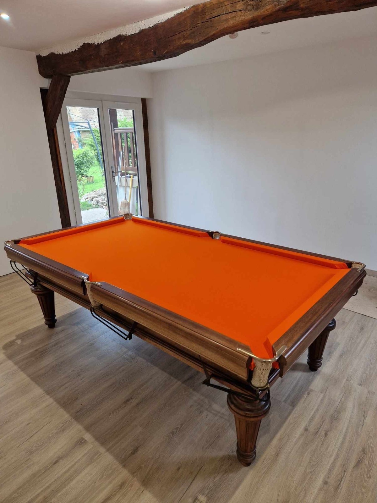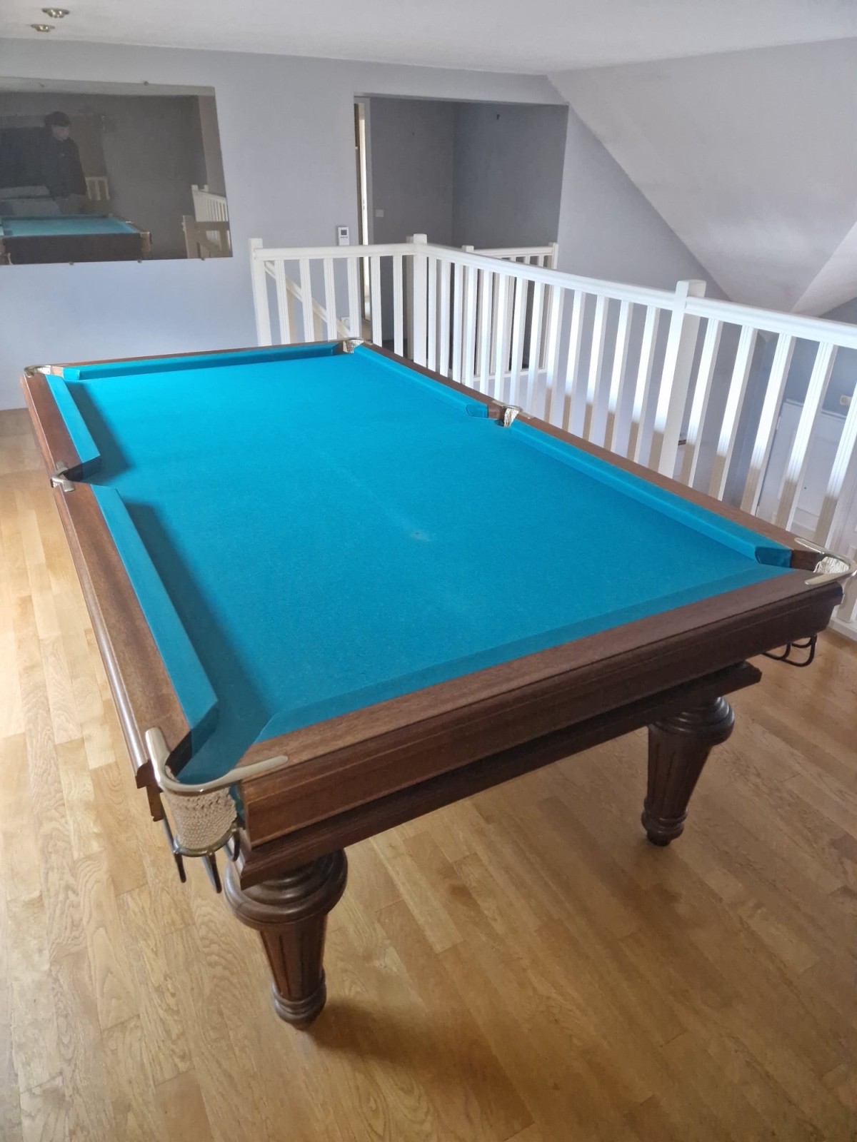 Déménagement et réfection de tapis sur un billard américain, 2,40 m en trois ardoises. Importé du Val-d’Oise dans le Vexin. (Cliquer ci-dessous pour plus de photos)