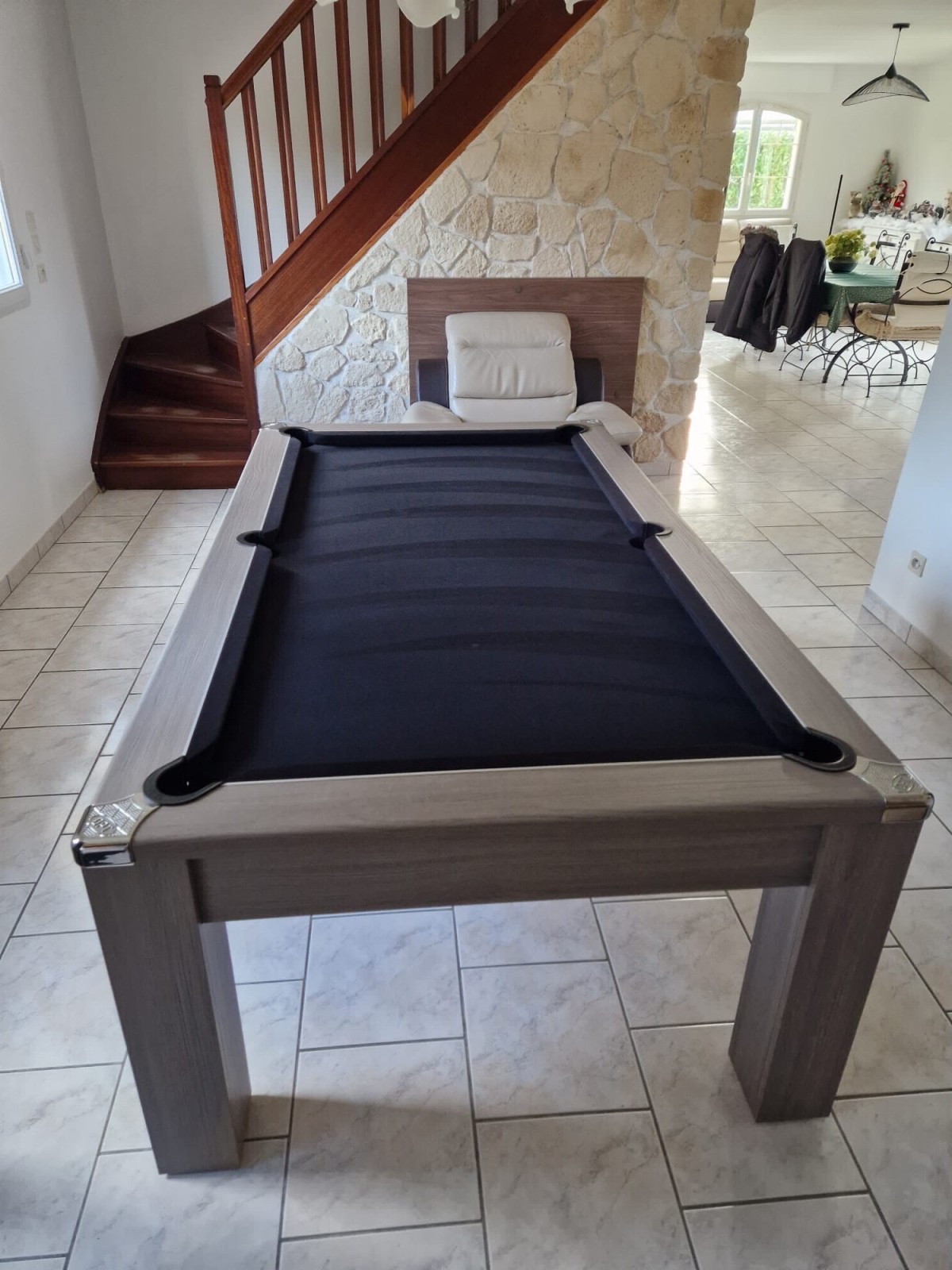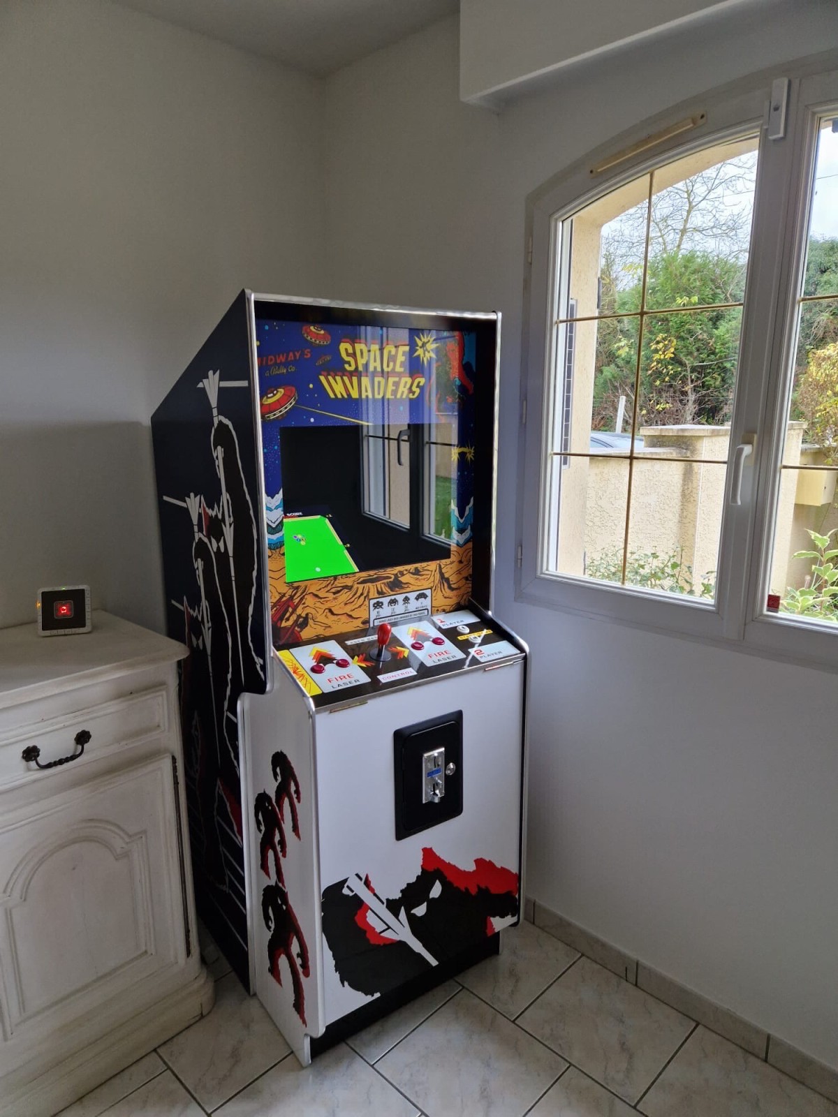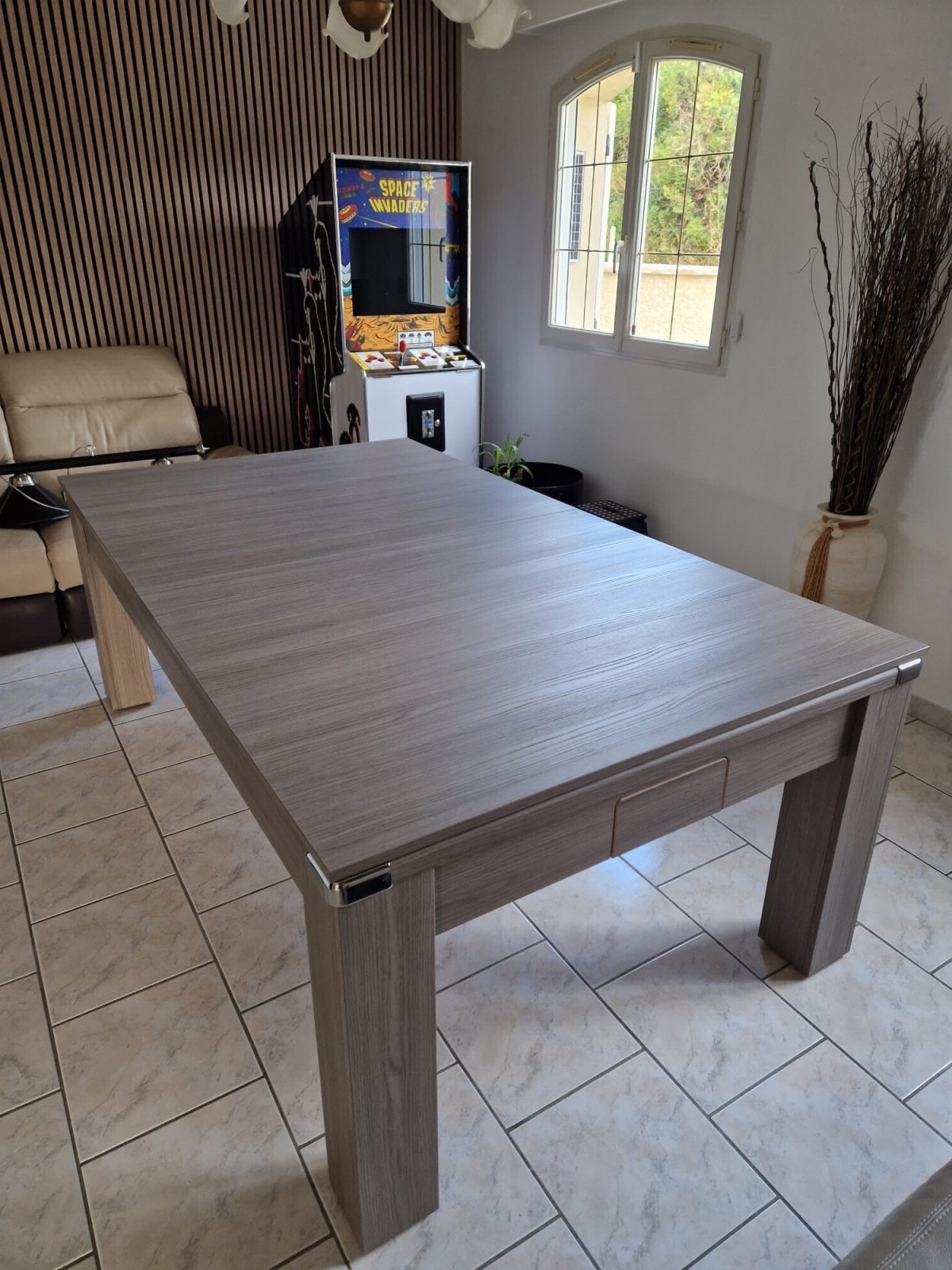 Livraison et installation d’une borne d’arcade « space invaders» et d’un billard table gris, tapis noir.